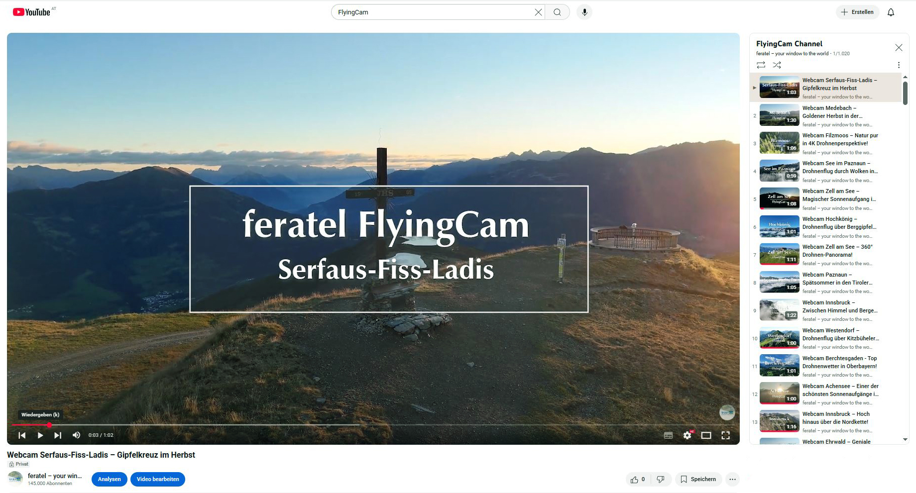 Tutte le FlyingCam sono disponibili in qualsiasi momento su www.feratel.com, sull'app feratel webcam e su YouTube!